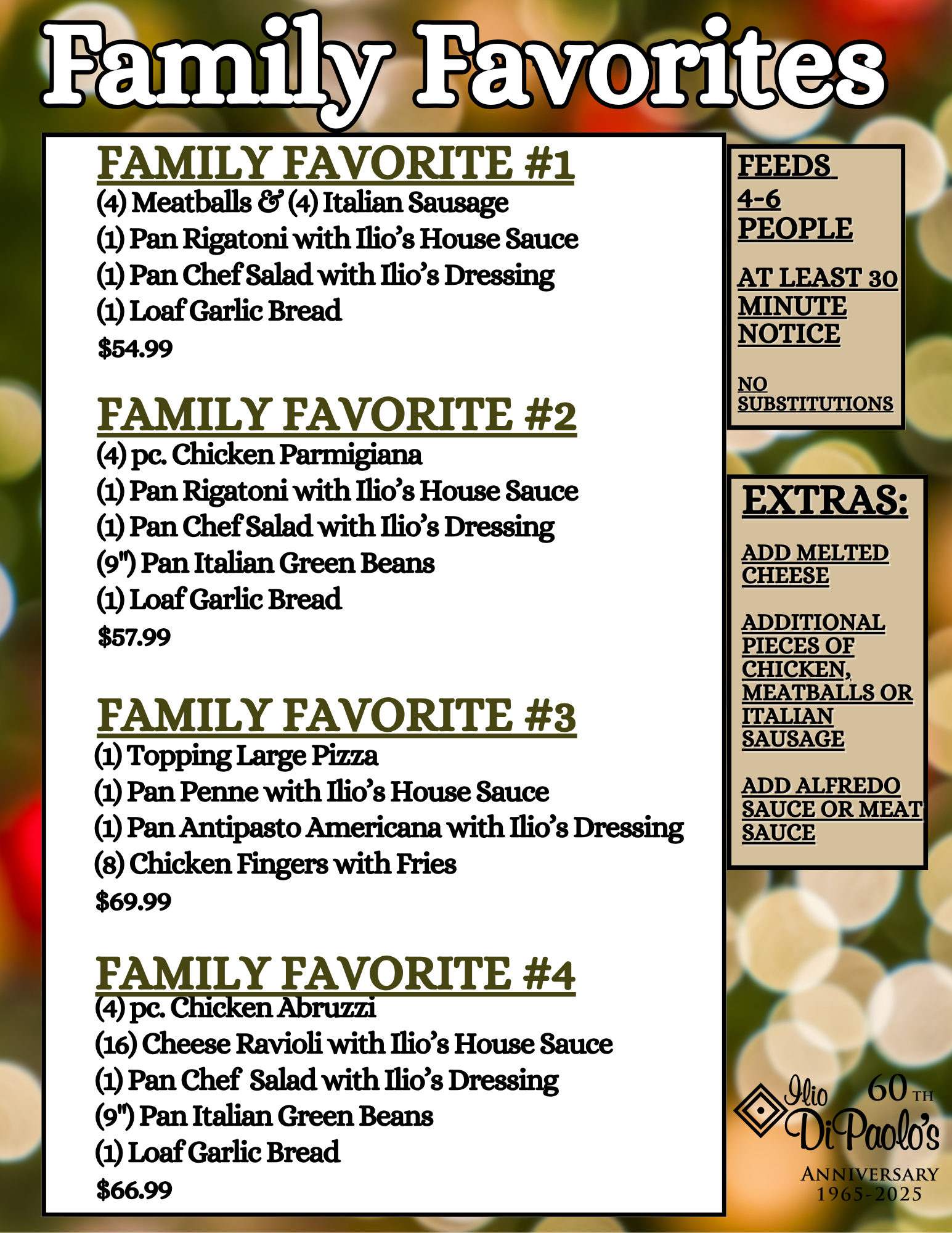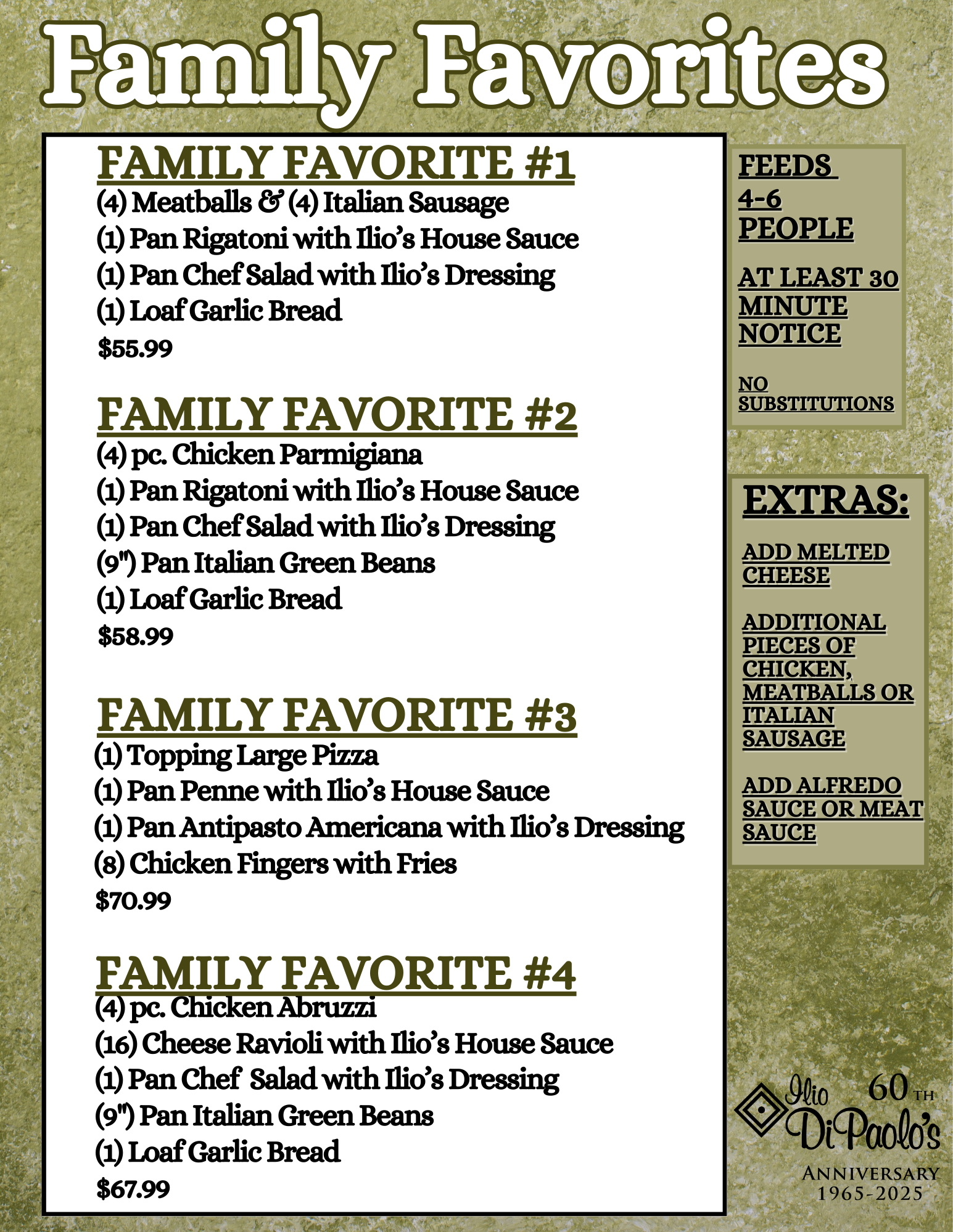 If you need a Family Favorite on a Monday or Tuesday, please place your order at least 2 days in advance with our Catering team. (716) 825-3675 ext. 2Available for take-out Wednesday-Sunday.