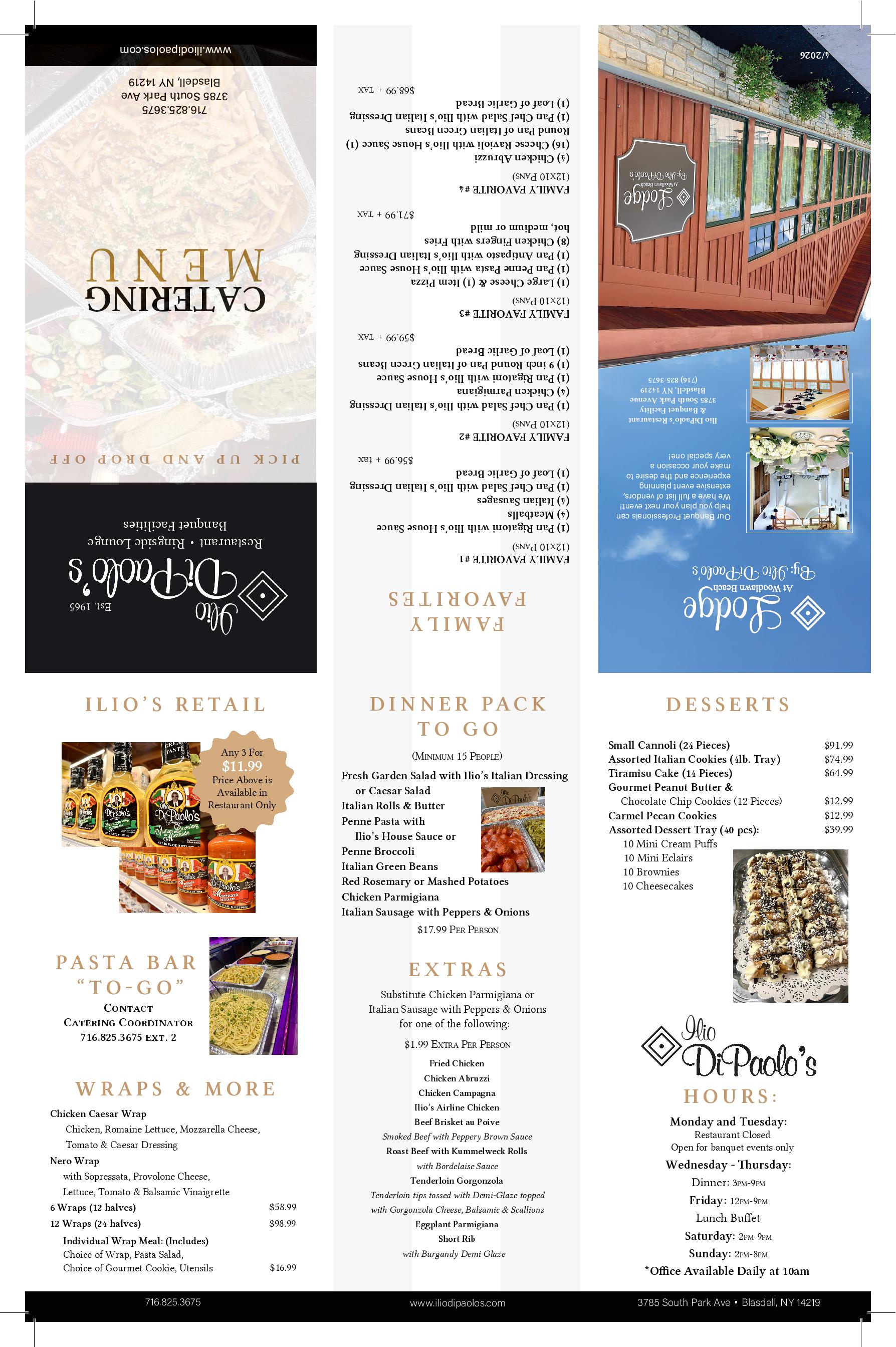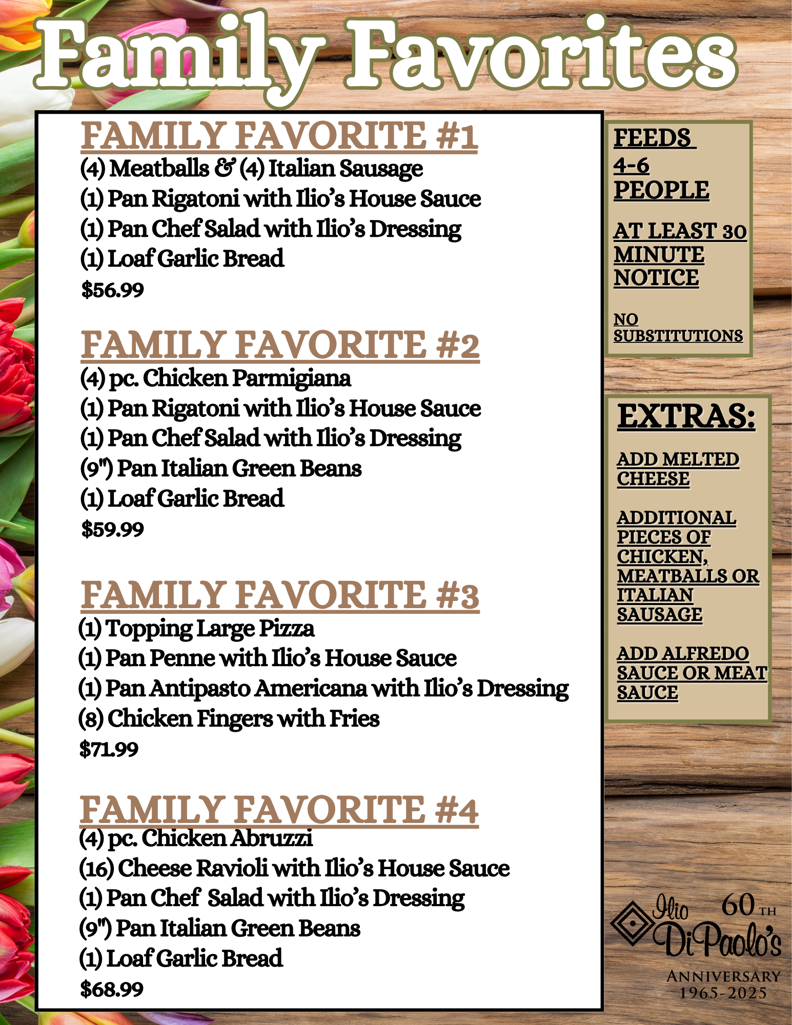 If you need a Family Favorite on a Monday or Tuesday, please place your order at least 2 days in advance with our Catering team. (716) 825-3675 ext. 2Available for take-out Wednesday-Sunday.