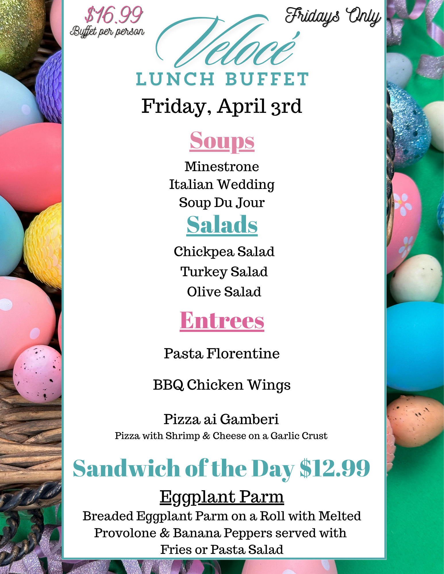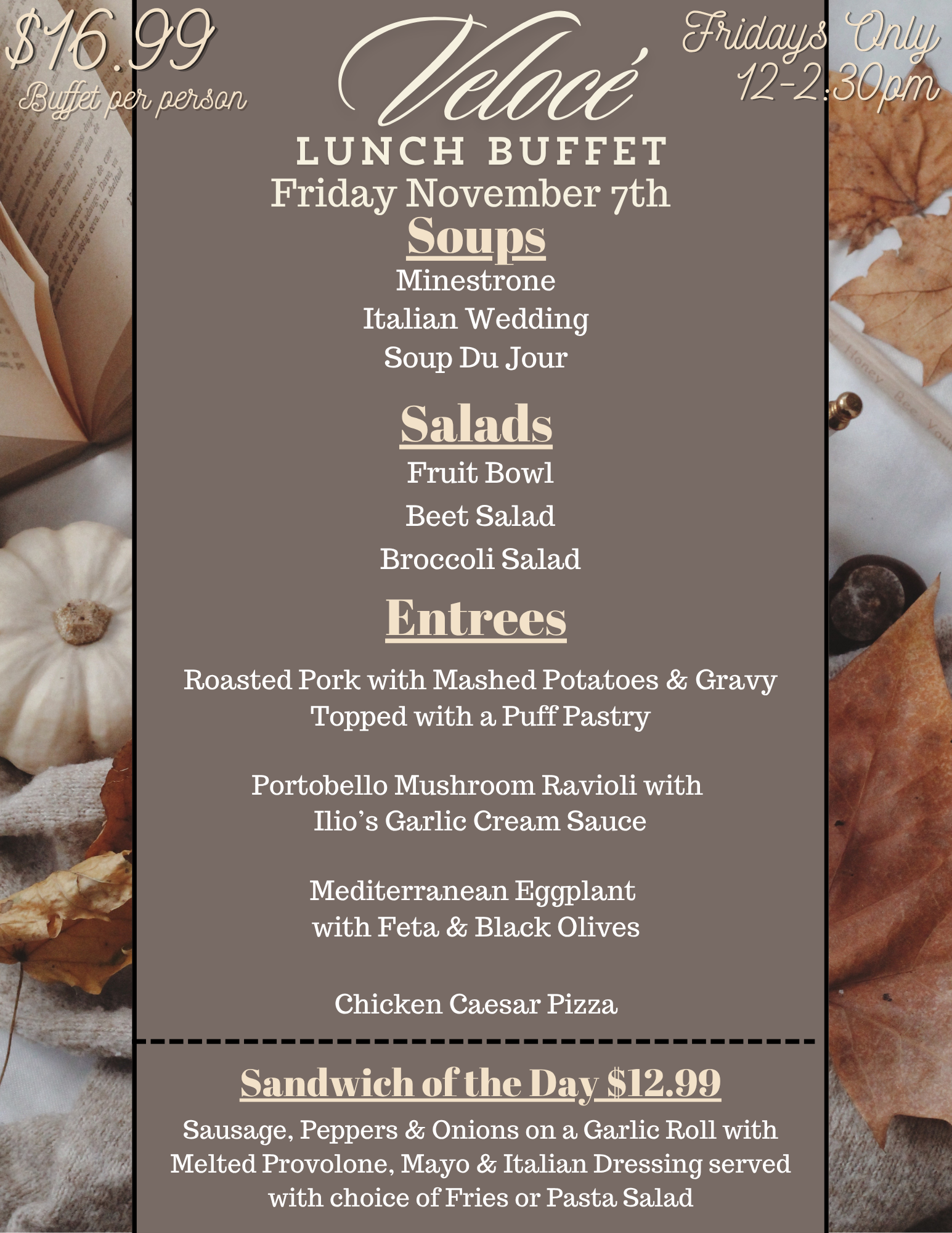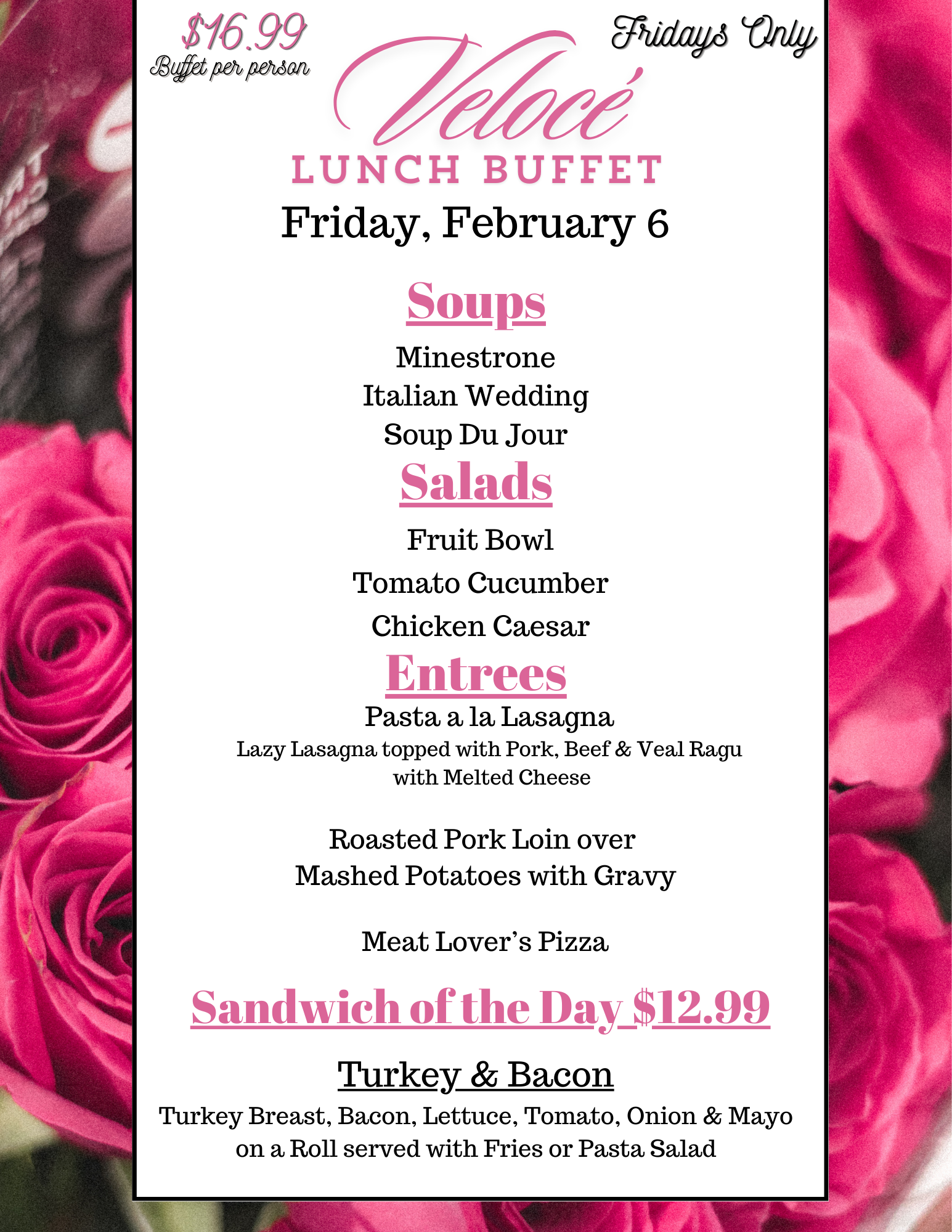 *No Substitutions to Velocé Buffet or Specialty Sandwich of the Day*