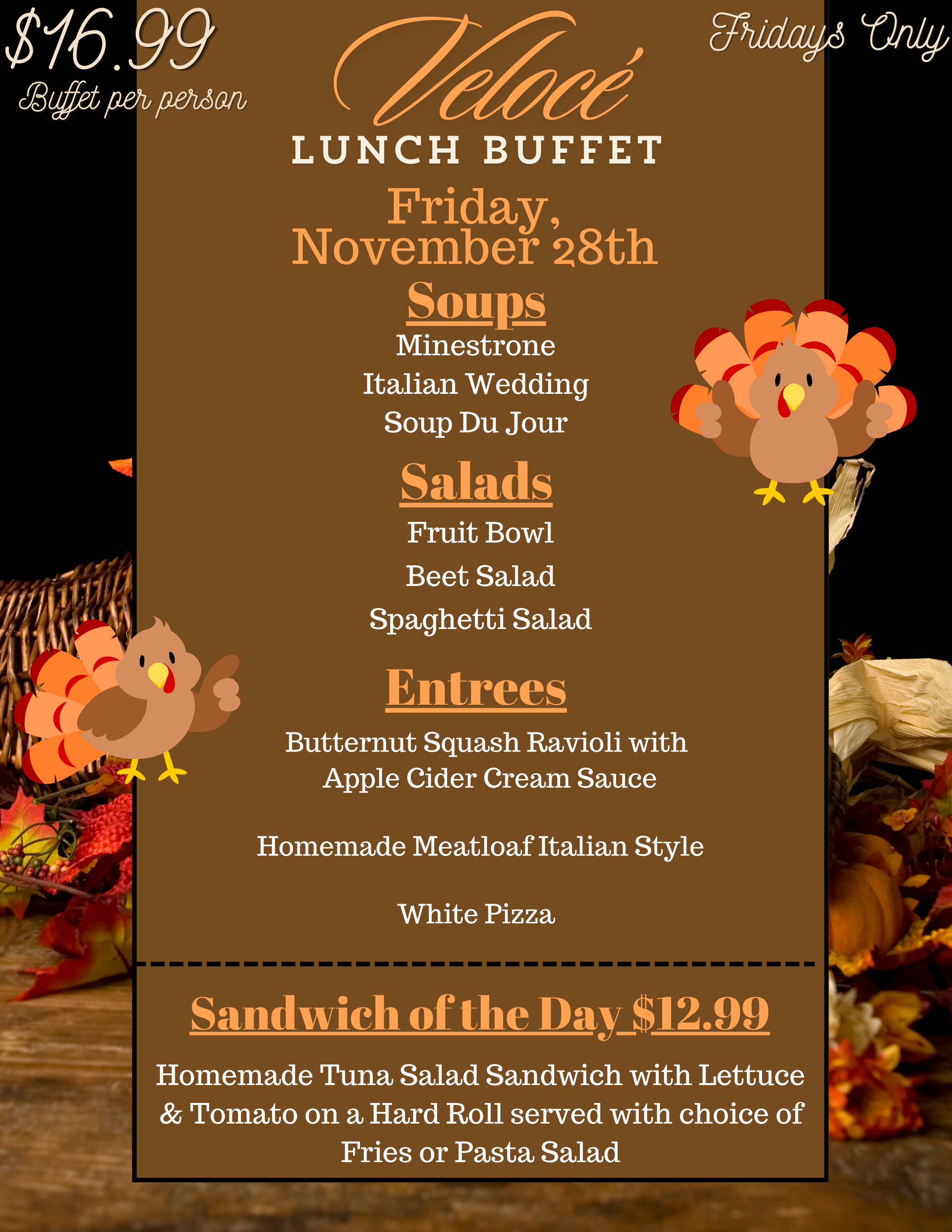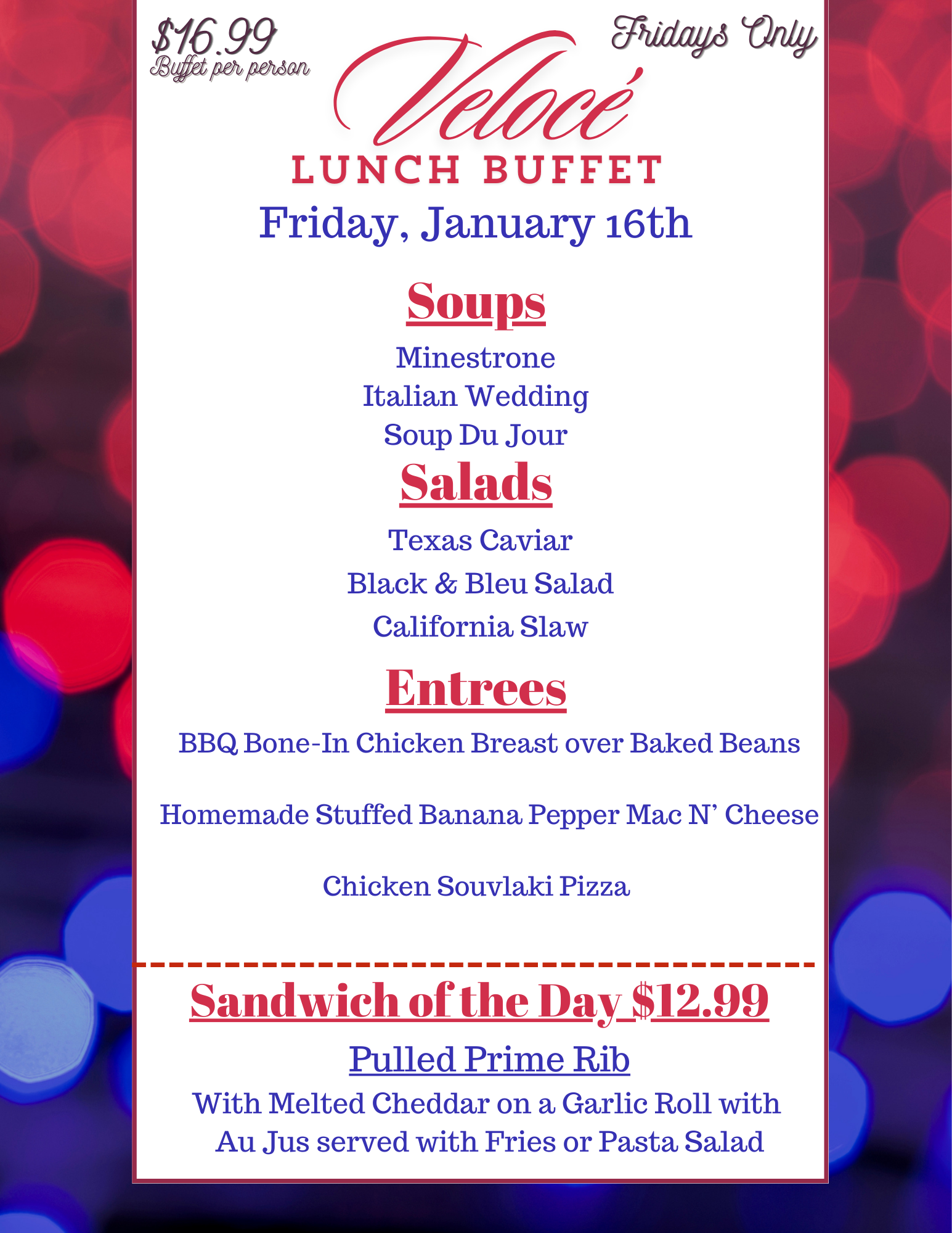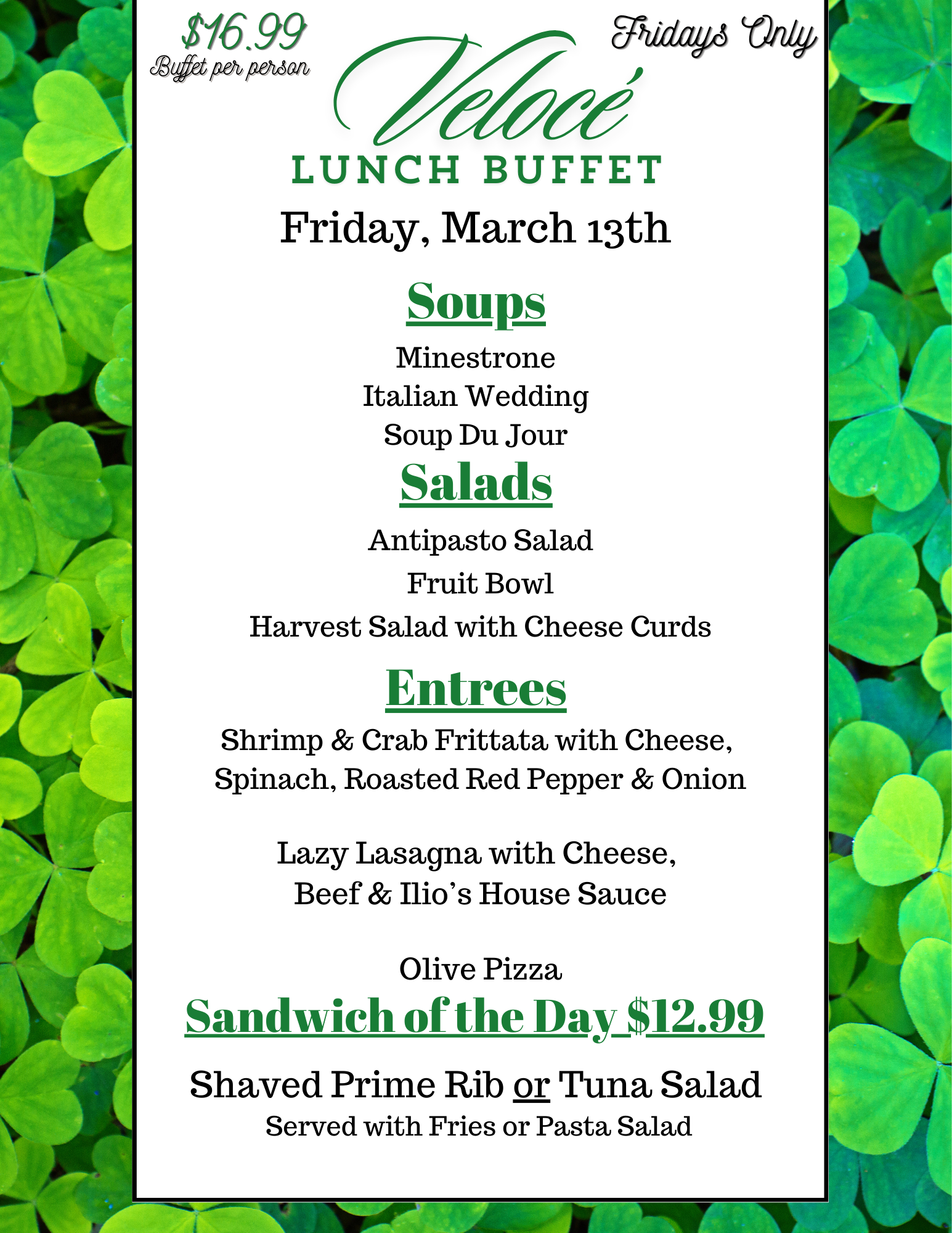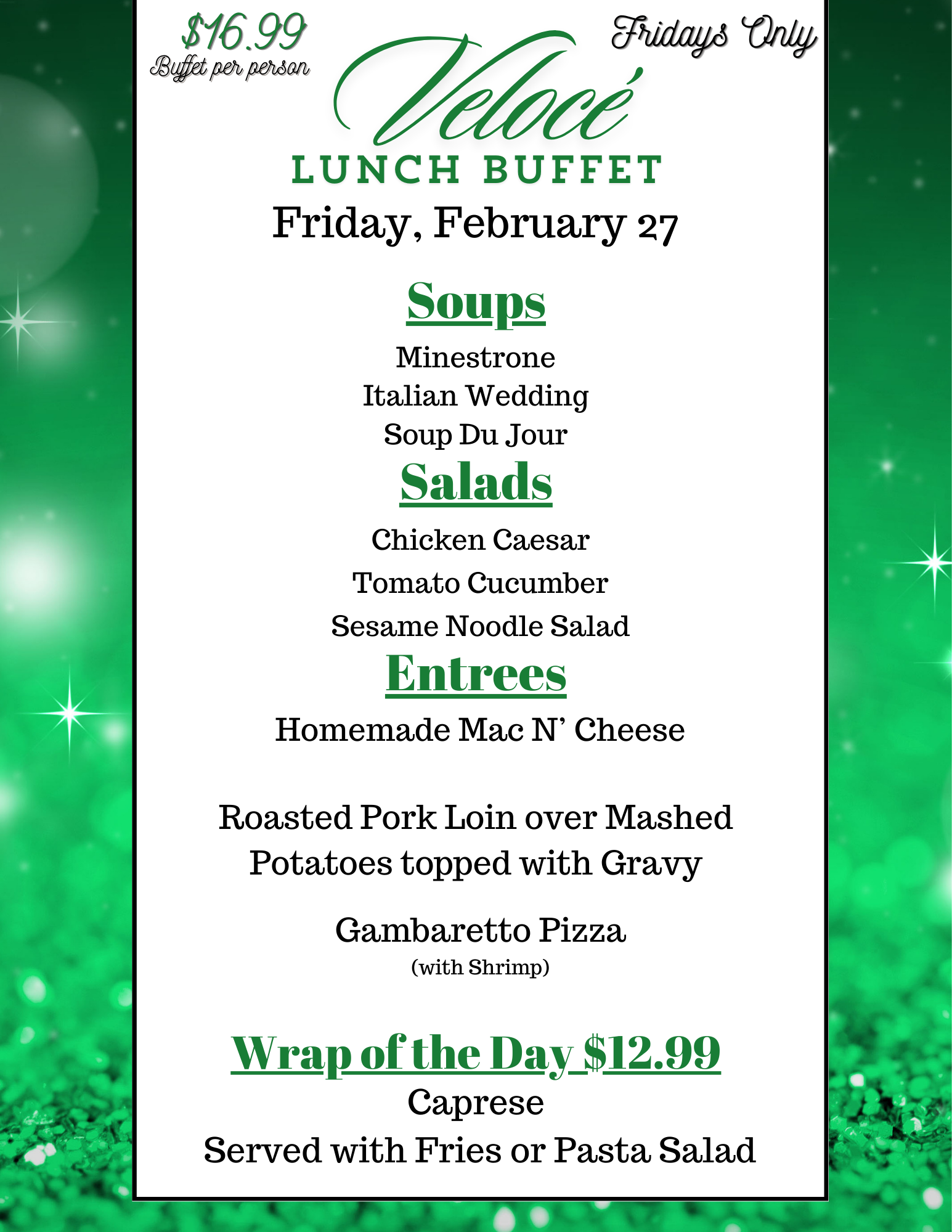 *No Substitutions to Velocé Buffet or Specialty Sandwich of the Day*