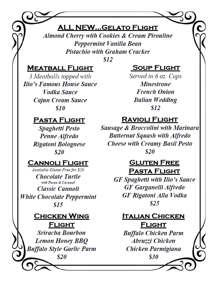 *Pasta Flight, Ravioli Flight & Chicken Flight come with choice of Soup or Salad!