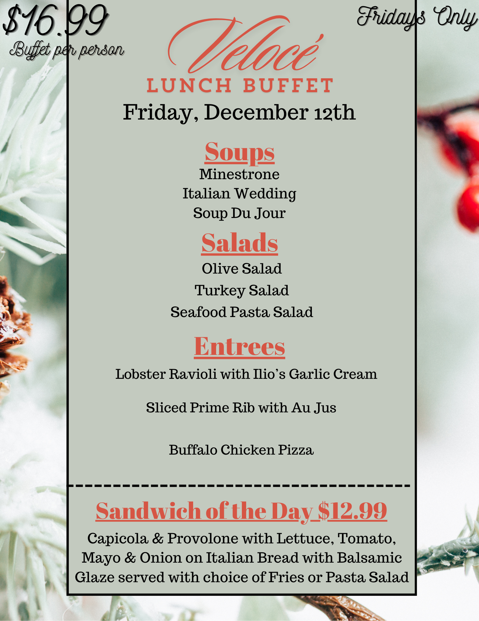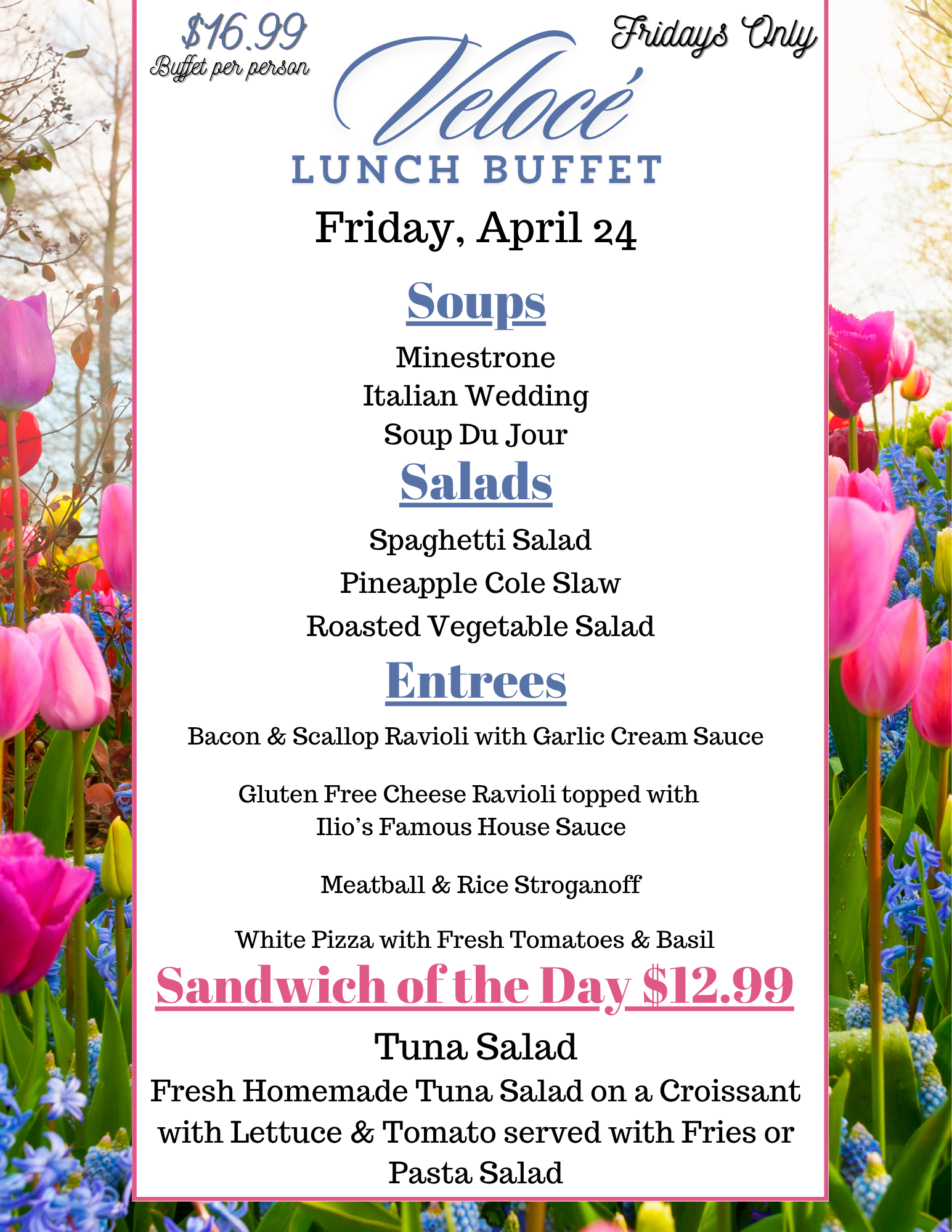 *No Substitutions to Velocé Buffet or Specialty Sandwich of the Day*